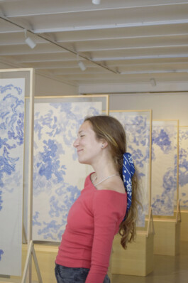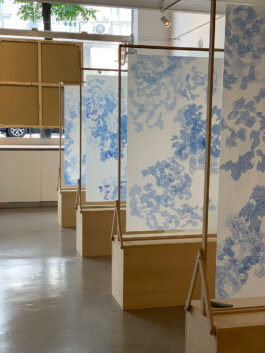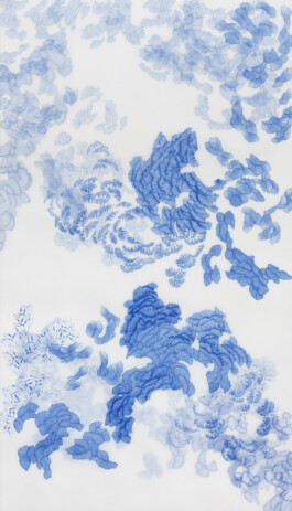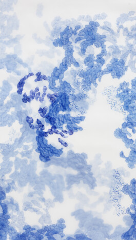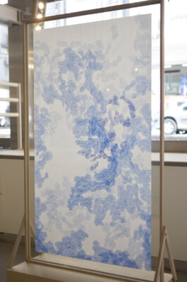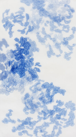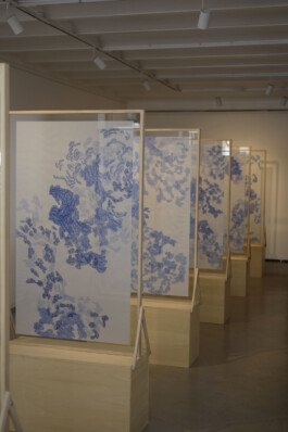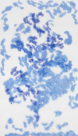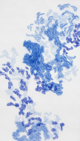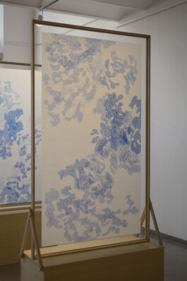 Es tal el grado de identidad entre las partes –insisto ¿acaso no es Mischa ella misma un procedimiento?– que esta exposición podría pensarse como una vivisección de la artista: obras a flor de piel que son también cuerpos ocupando, junto con las personas que lo visiten, el espacio de la sala. Los leves paneles de tintas azules y reminiscencia japonesa tienen, curiosamente, la misma altura que la artista; paneles en los que la translucidez deja en evidencia el proceso de sumar capa sobre capa y así ir descubriendo –¿o será cubriendo?– lo que habita en lo profundo de la esencia; paneles que muestra una grafopoesis, o la capacidad viva de un dibujo que se fue dictando a sí mismo mientras la artista apenas parecería intervenir, dejando que su hombro, brazo, codo, mano, dedos, sean simples instrumentos de eso que crece en azul o en negro, allí, frente a sus ojos.