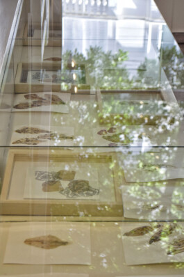 En otra parte de la sala, abriéndose a una poética más doméstica encontramos una mesa –signo preferencial para representar el trabajo– que da cuenta de cómo la artista procede en su tarea de escuchar al dibujo. Está cubierta por las obras tal como son realizadas antes de colgar verticales. Para apreciarlas en sus detalles, tenemos que inclinar nuestro cuerpo y adoptar un gesto que se parece mucho a la entrega; se nos invita a girar alrededor de la instalación dada la capacidad de ser observadas sin un punto de vista privilegiado.